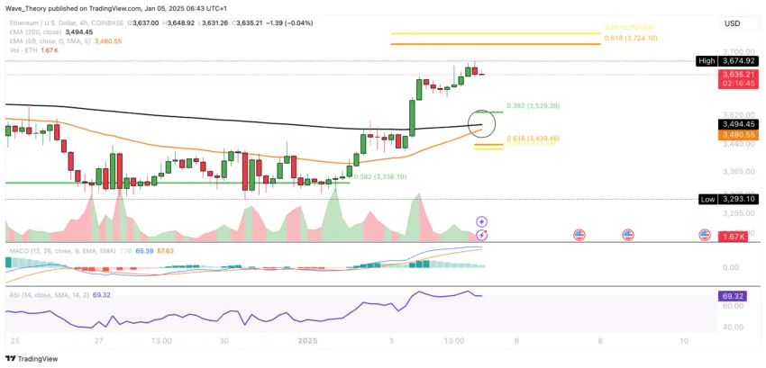 Der Ethereum Kurs konnte an der 0,382 Fib Unterstützung bei rund 3.336 USD bullisch abprallen und in Zuge dessen den 50-Tage-EMA Widerstand bei rund 3.440 USD überwinden.