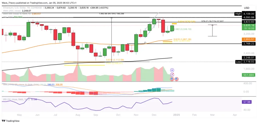 Sofern sich Ethereum über der Golden Ratio bei rund 2.800 USD hält, bleibt der Aufwärtstrend ohnehin bullisch intakt. Zudem fungiert der 50-Wochen-EMA bei rund 2.954 USD als weitere Unterstützung.