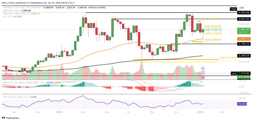 Ansonsten wartet spätestens bei rund 2.850 USD signifikante Golden Ratio Unterstützung auf den ETH Kurs. Zudem fungiert der 50-Wochen-EMA bei rund 2.982 USD als weitere Unterstützung.