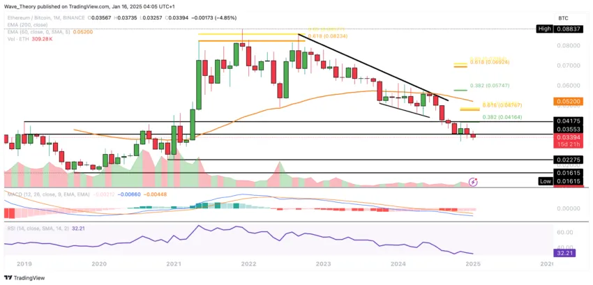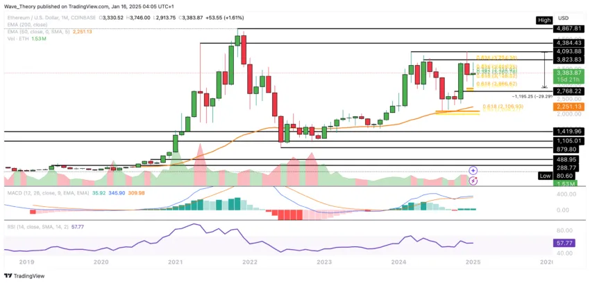 Insgesamt bleibt der Aufwärtstrend bullisch intakt, solange sich Ethereum über der Golden Ratio Unterstützung bei rund 2.100 USD hält. Dort fungiert zudem der 50-Monate-EMA als zusätzliche Unterstützung.