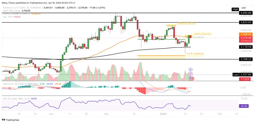 Der Ethereum Kurs wurde am Golden Ratio Niveau bei rund 3.450 USD bärisch abgewiesen
