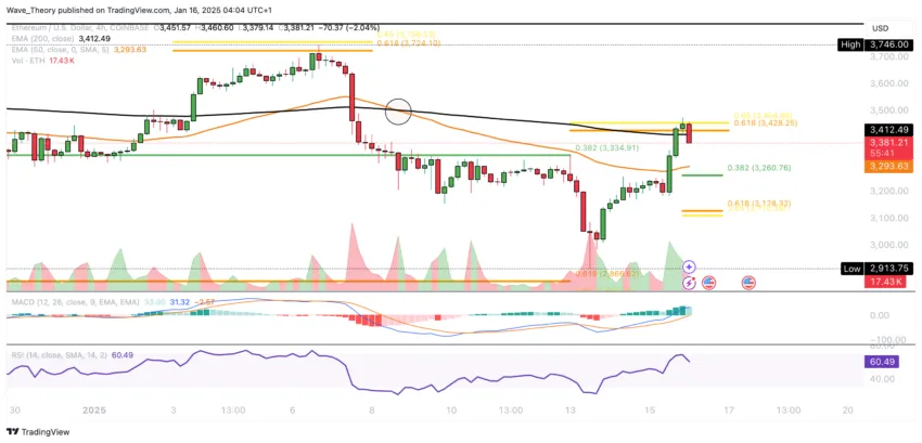 In den letzten zwei Tagen initiierte Ethereum dabei eine Aufwärtsbewegung, womit Ethereum jetzt den Golden Ratio Widerstand bei rund 3.450 USD erreicht hat. Dort scheint Ethereum heute erneut auf bärische Ablehnung zu stoßen.