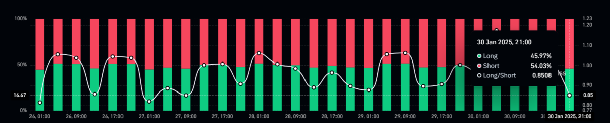 Die Marktpositionierung spiegelt diese Unsicherheit wider: 54,03 % des Handels entfallen auf Short-Positionen, während 45,97 % auf Long-Positionen entfallen. Das Verhältnis von Long- zu Short-Positionen liegt bei 0,85, was auf vorsichtigen Optimismus, aber auch auf eine insgesamt schwache Stimmung hindeutet.