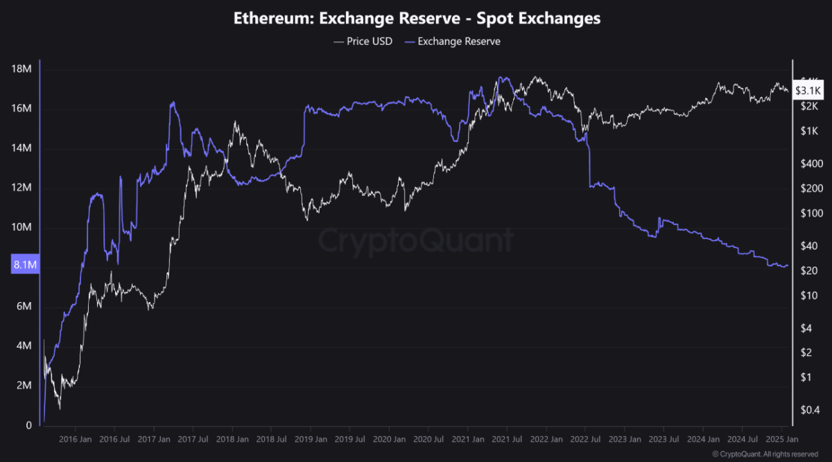 Die Ethereum-Reserven sind laut CryptoQuantauf ein Sechsjahrestief von 8,1 Millionen $ETH gefallen . Dieser starke Rückgang deutet auf eine wachsende Vorliebe für langfristiges Halten hin, da die Anleger trotz der Unsicherheit auf dem Markt ihr Vermögen fest im Griff haben.