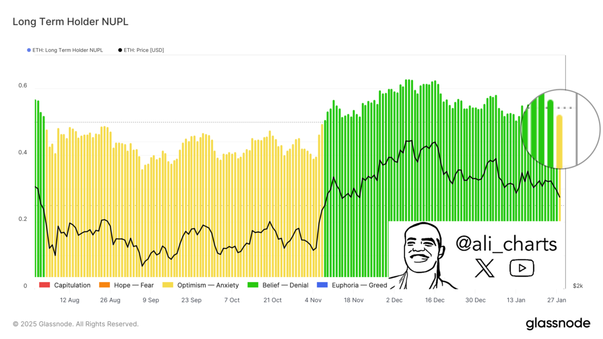 Der Kryptoanalyst Ali Martinez stellte fest, dass die langfristigen Besitzer von Ethereum erste Anzeichen von Unbehagen zeigen. Die neuesten Daten von Glassnode zeigen eine Verschiebung des Net Unrealized Profit/Loss (NUPL)-Gefühls von „Belief“ zu „Anxiety“ Dieser Übergang signalisiert eine wachsende Unsicherheit auf dem Markt, die mit der Preisvolatilität von Ethereum und der Möglichkeit von Gewinnmitnahmen einhergeht.