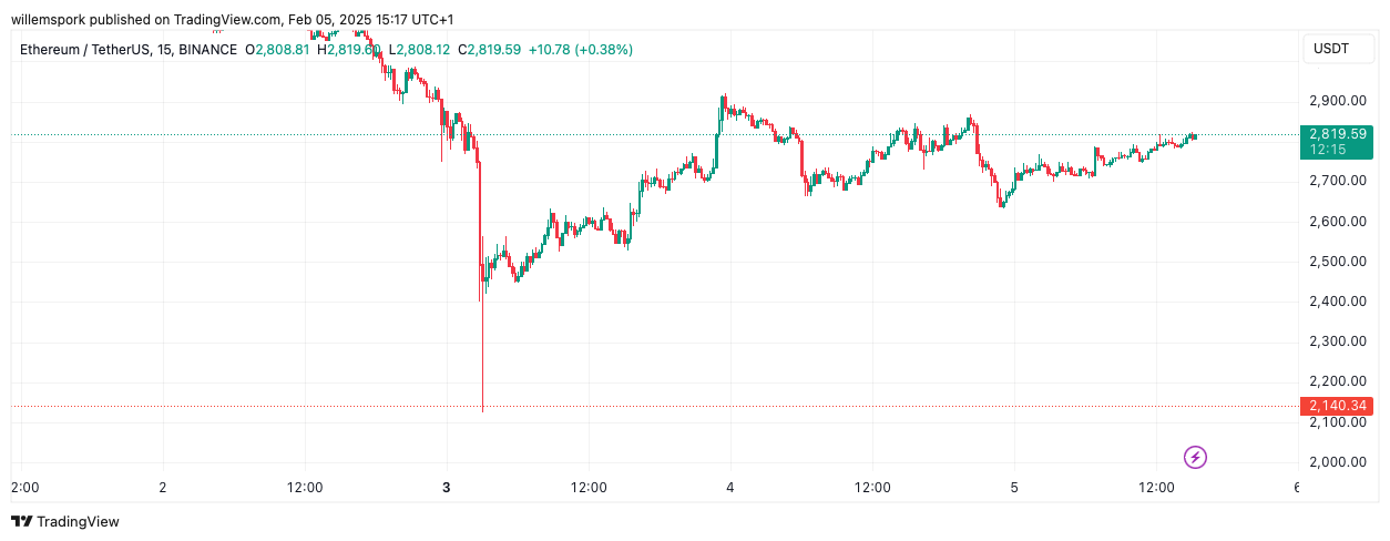 Später am Tag mischte sich Eric Trump, Sohn von Präsident Donald Trump, in die Diskussion ein. Auf X ermutigte er seine Follower, $ETH zu kaufen, was sofort zu noch mehr Volatilität auf dem Markt führte. $ETH stieg kurzzeitig auf fast $2.900, fiel jedoch wieder zurück. Zum Zeitpunkt der Abfassung wird Ether bei $2.818 gehandelt, ein Anstieg von 3,5 % im Vergleich zu gestern.