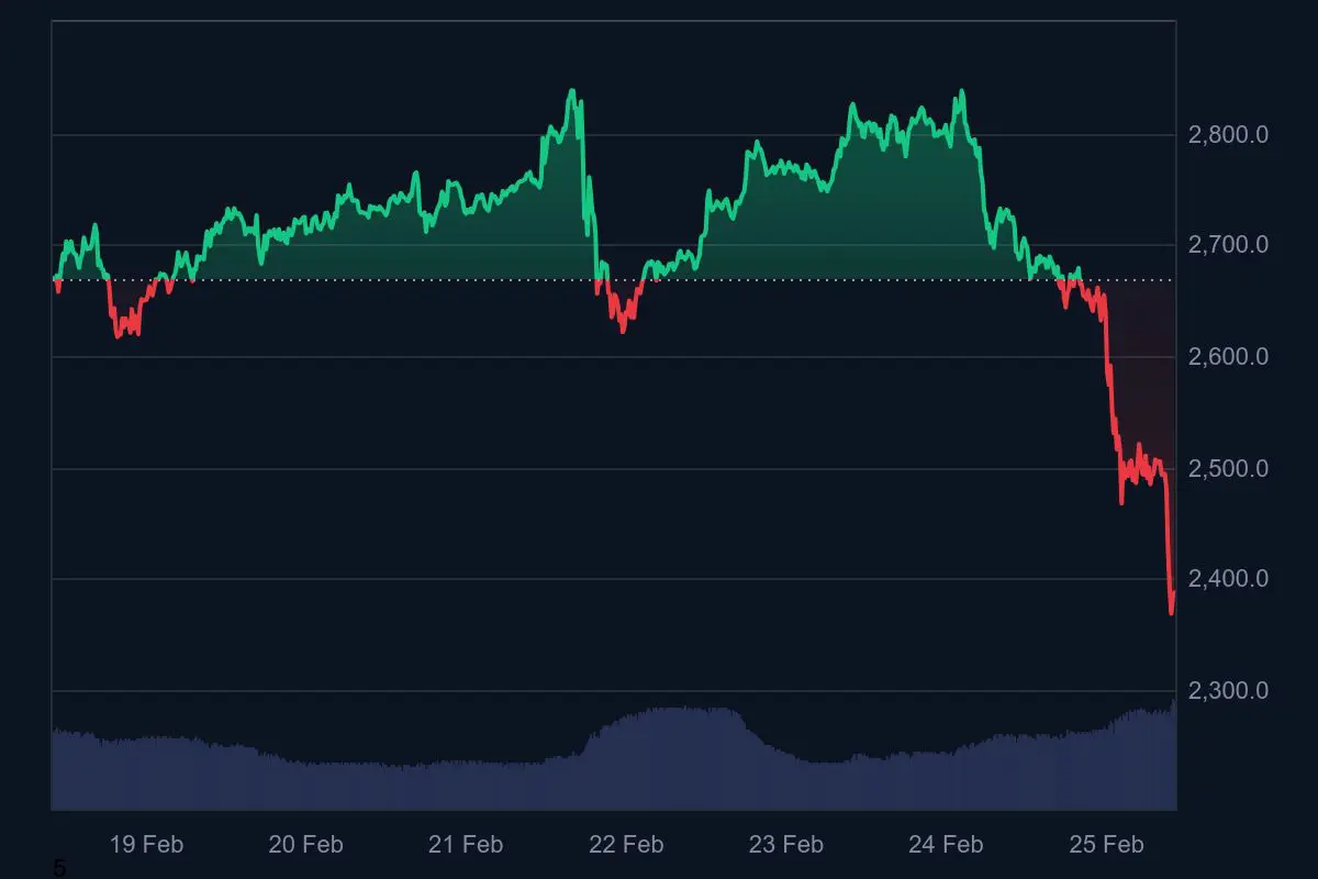 Ethereum liegt aktuell bei 2.370 Dollar nach einer starken Korrektur in den letzten Tagen. Innerhalb der letzten 24 Stunden ist der $ETH-Kurs um fast 13 % gefallen. Seit Montagmorgen beträgt der gesamte Rückgang sogar mehr als 17 %.