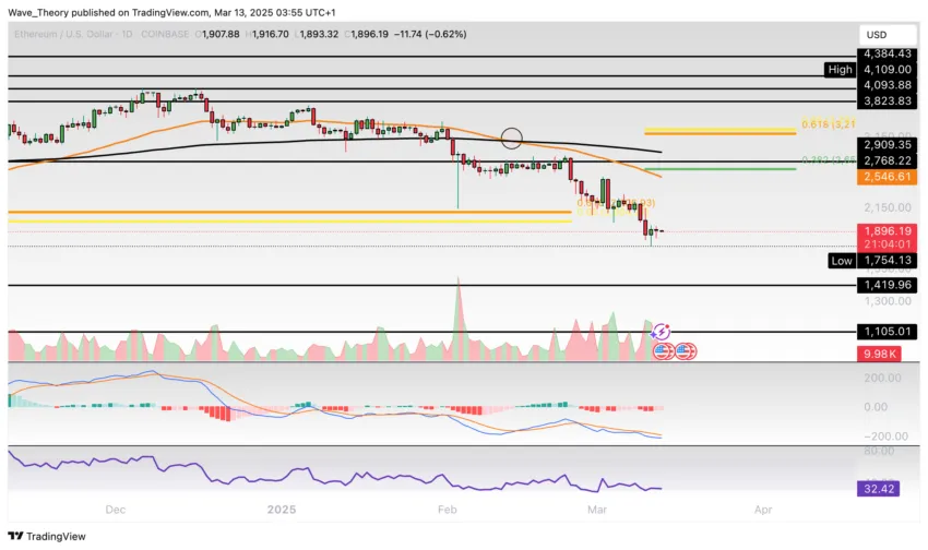 Ethereum-Prognose für Donnerstag, 13. März 2025: Der Ethereum Kurs scheint jetzt bärisch auszubrechen. Damit könnte er eine Etage tiefer fallen.