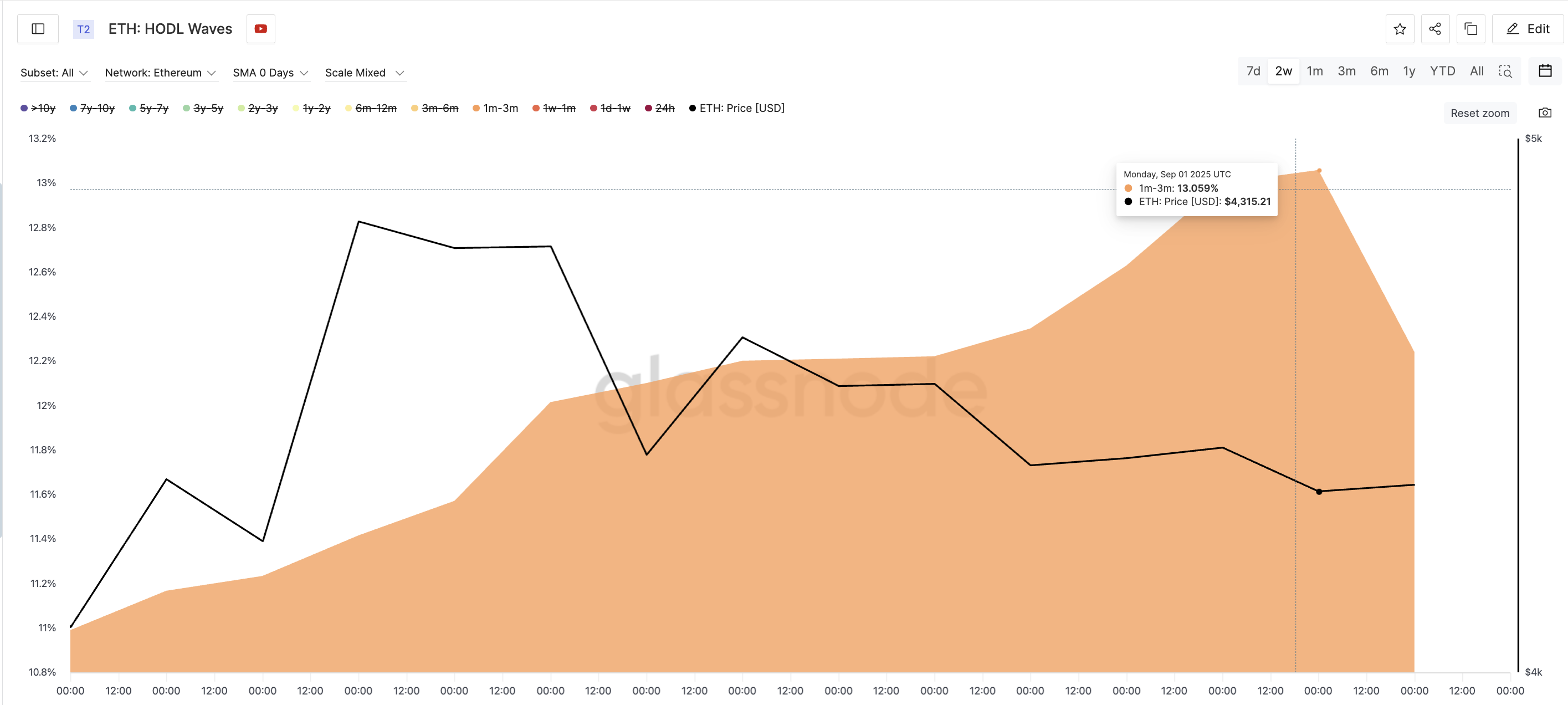 Das überraschendere Detail ist, dass die Gruppe, die am anfälligsten für Gewinnmitnahmen ist — Inhaber von ein bis drei Monaten — ihre Bestände aufgestockt hat. Ihr Anteil stieg von 10,9 Prozent auf 13 Prozent in nur zwei Wochen, obwohl ETH über 20 Prozent monatliche Gewinne und mehr als 68 Prozent in drei Monaten erzielte.
