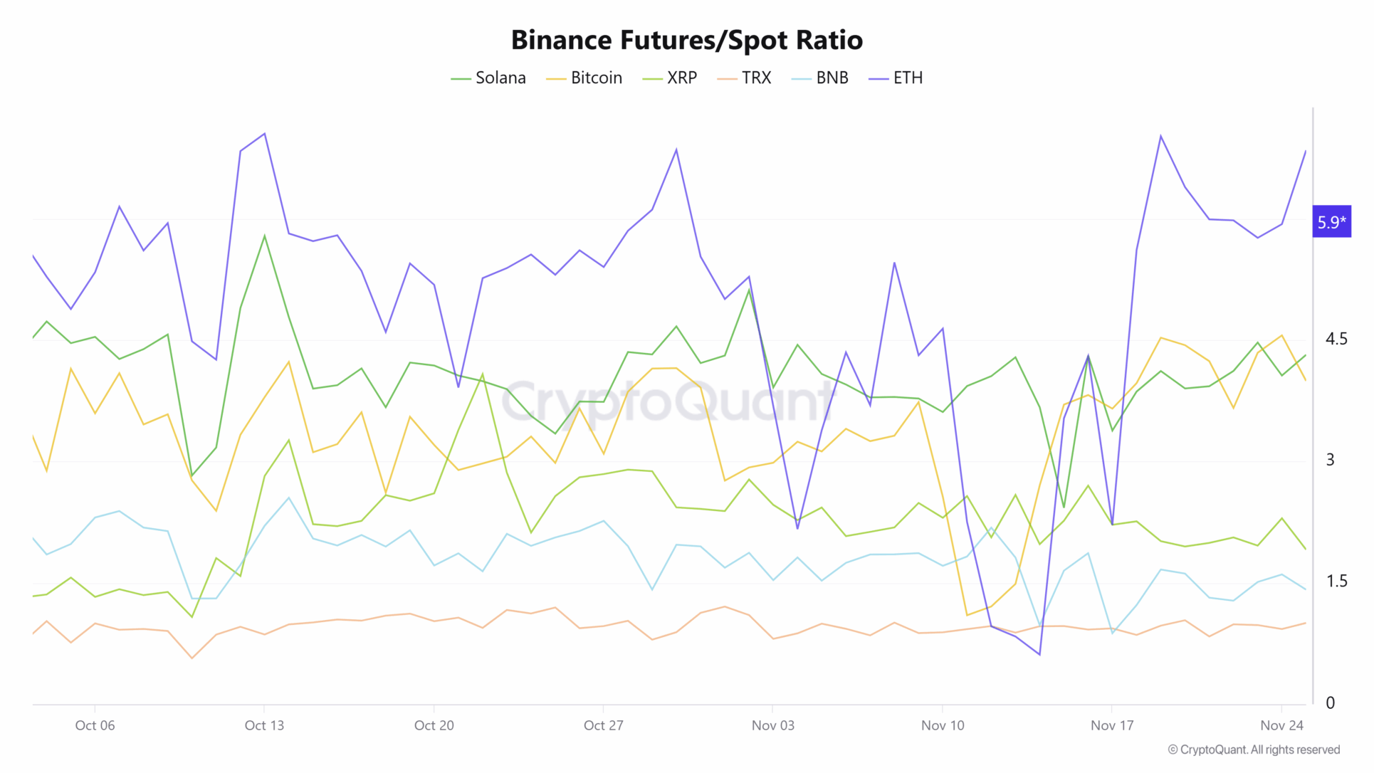 Aus Daten von CryptoQuant geht hervor, dass das sogenannte Futures-zu-Spot-Verhältnis von Ethereum bei Binance auf 6,84 gestiegen ist – den höchsten Stand dieses Quartals. Diese Kennzahl zeigt, in welchem Umfang Anleger mit geliehenem Kapital handeln im Vergleich zu direkten Käufen am Spotmarkt.