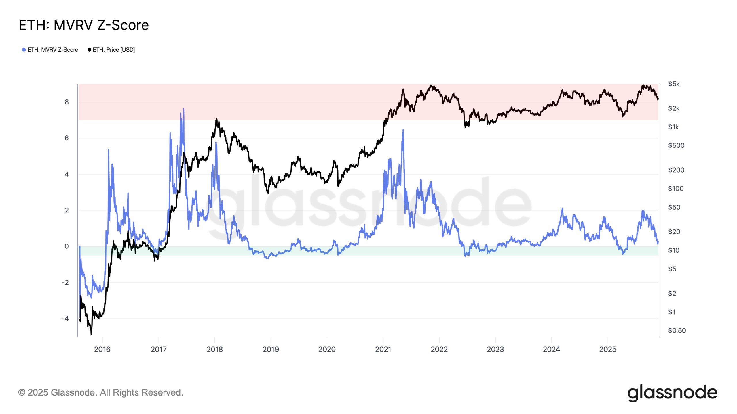 Eine Prognose, die auch durch den MVRV-Z-Score gestützt wird: Sollte ETH noch einmal absacken, würde der Indikator in eine historisch günstige Akkumulationszone eintreten. Aus Sicht vieler Langfrist-Investoren wäre das ein klares Kaufsignal. Unter günstigen Bedingungen scheint der Boden also nicht mehr allzu weit entfernt.