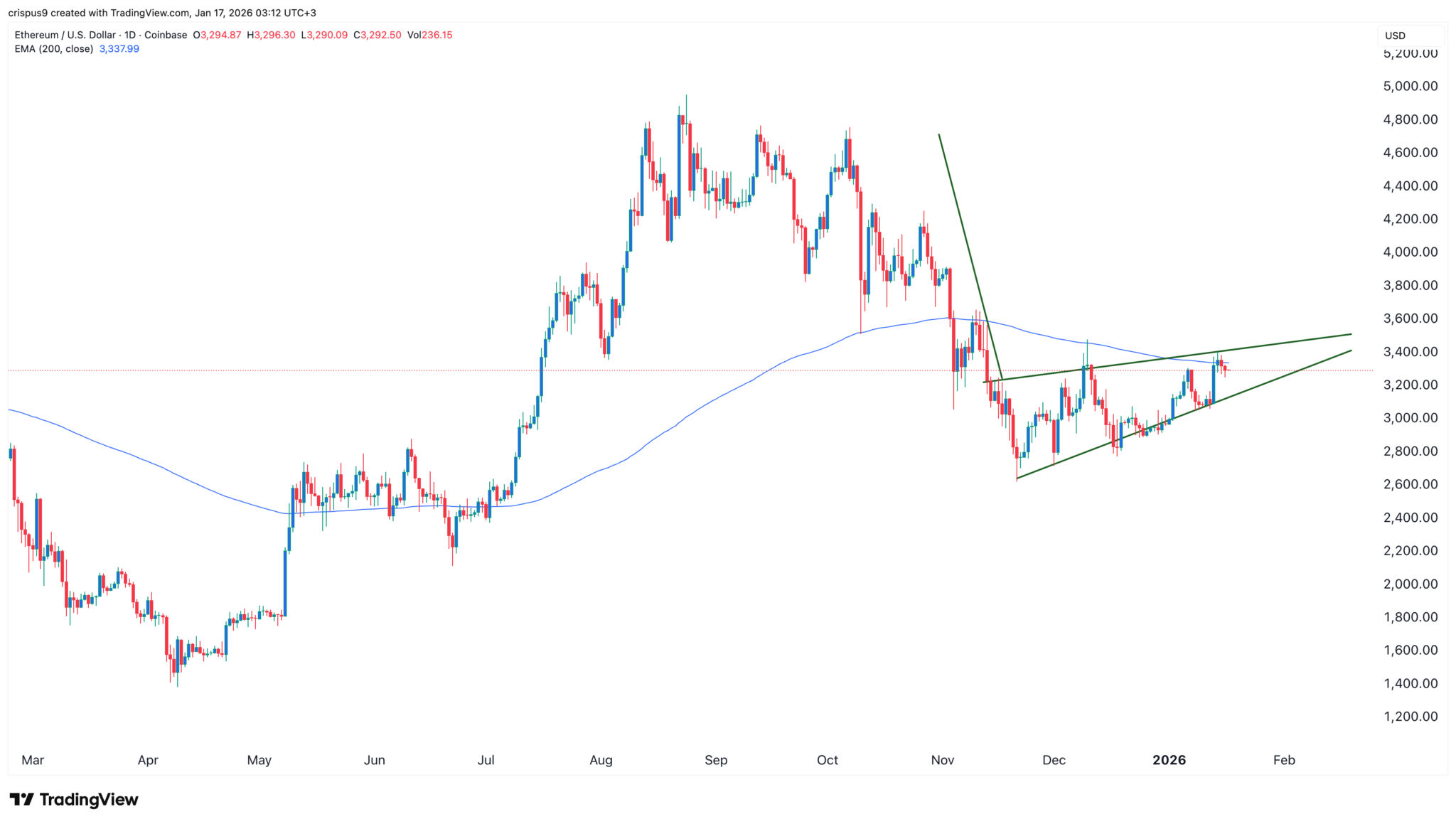 Der Tages-Chart zeigt, dass die Erholung des Ethereum-Kurses beim 200-Tage-Exponential Moving Average (EMA) ins Stocken geraten ist. Außerdem hat sich ein steigendes Keilmuster gebildet, ein häufiges Anzeichen für eine rückläufige Trendwende, das aus zwei ansteigenden und konvergierenden Trendlinien besteht.