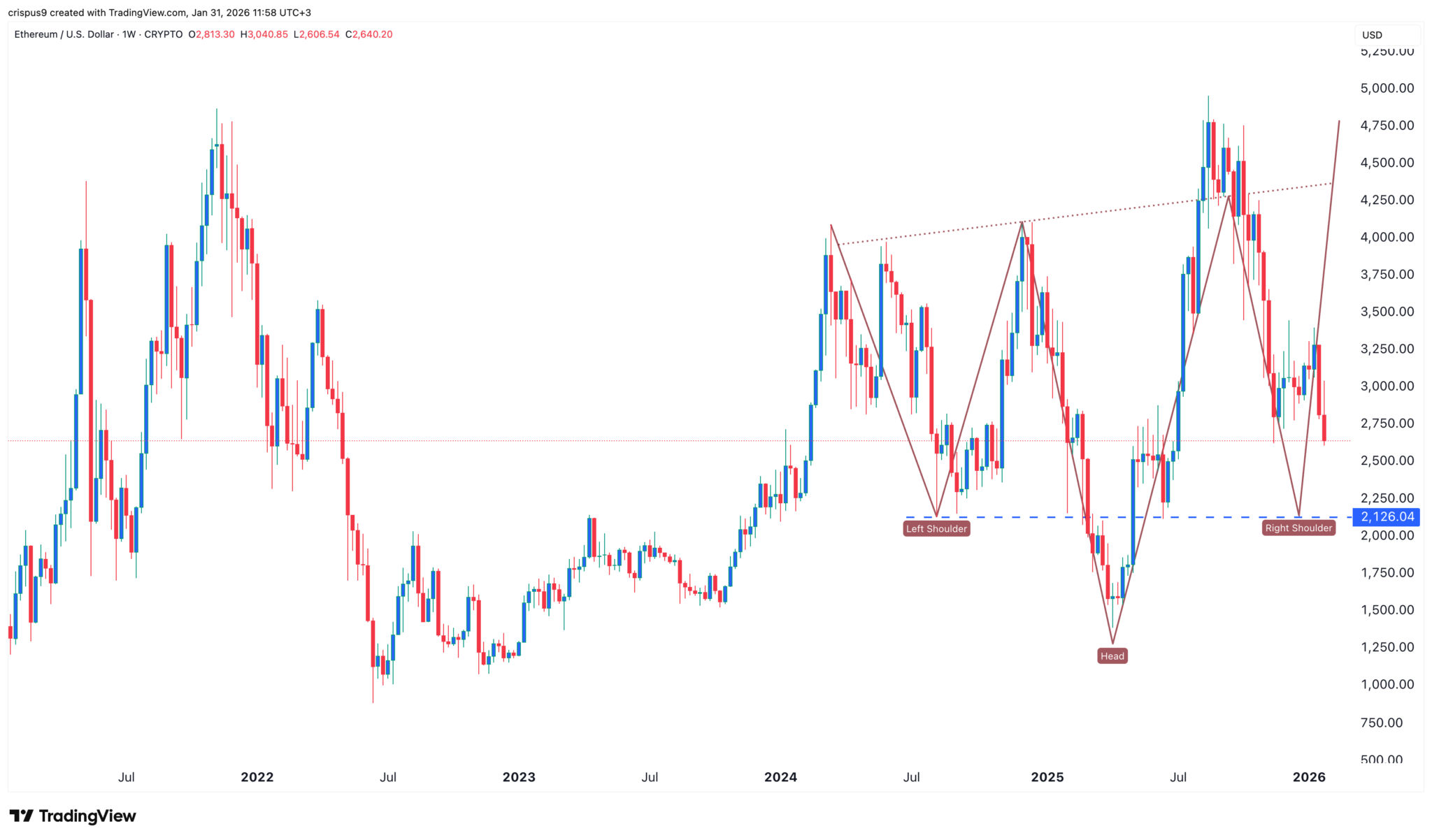 Deshalb passiert der aktuelle Ethereum-Kursverfall, während der Token die linke Schulter bei 2.125 $ anvisiert. So könnte er in den nächsten Wochen auf dieses Niveau fallen und dann wieder stark ansteigen. Ein Rückgang unter 2.125 $ würde die bärische Prognose aber zunichte machen.