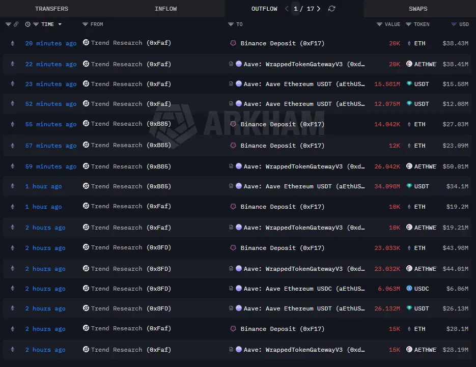 Laut Daten von Arkham Intelligence hat Trend Research weitere 23.000 $ETH im Wert von 43,98 Millionen US-Dollar an Binance zur Liquidation gesendet, um seine ausstehenden Schulden auf der Aave Plattform zu bedienen.
