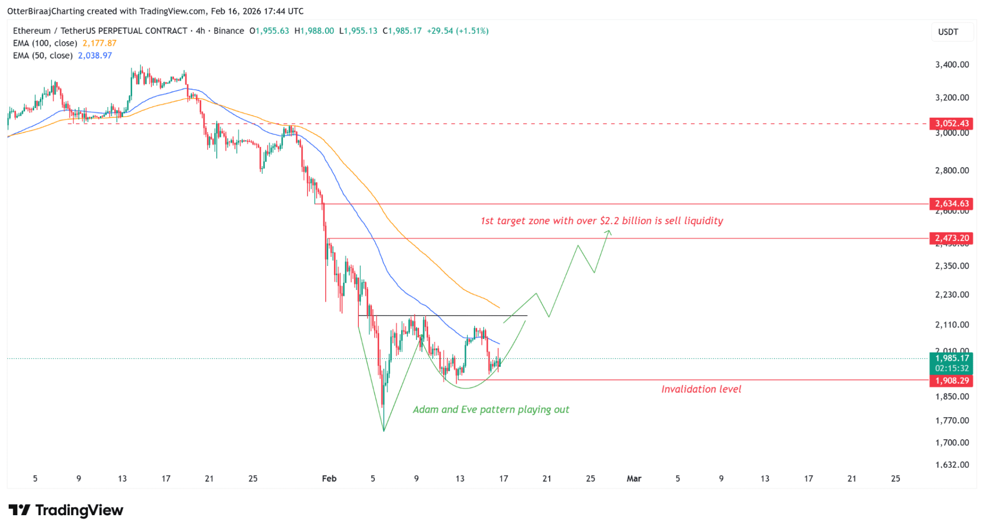 Auf dem Vier-Stunden-Chart zeichnet sich ein sogenanntes Adam-und-Eva-Bodenmuster ab. Dieses technische Muster besteht aus einem scharfen V-förmigen Rückgang gefolgt von einer allmählichen Abrundung. Ein Durchbruch über 2.150 Dollar würde das Muster bestätigen, mit einem möglichen Kursziel zwischen 2.473 und 2.634 Dollar.