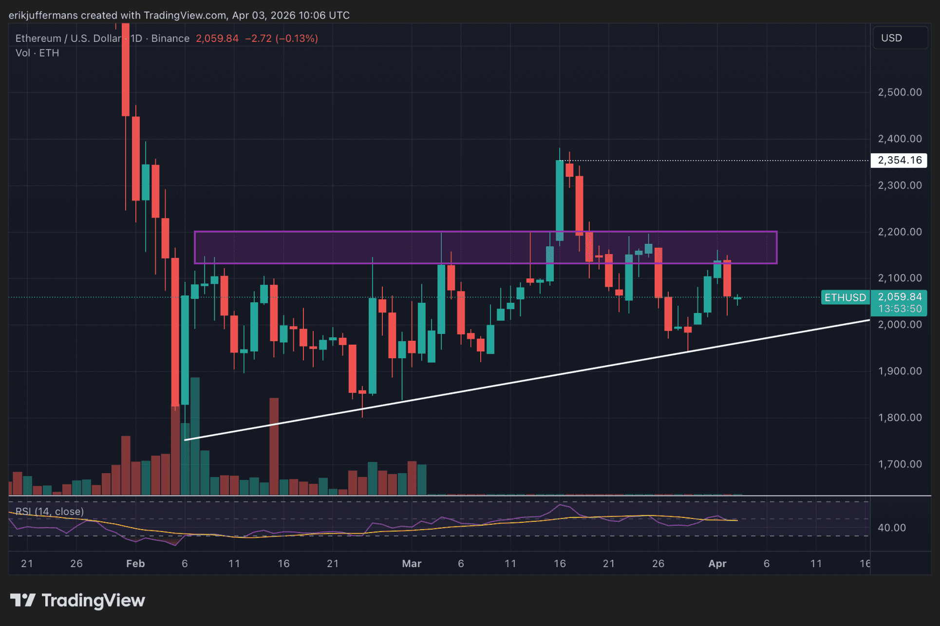Wir müssen zwei Dinge im Auge behalten: die lila Widerstandszone und die aufsteigende Trendlinie. Ein Durchbruch einer dieser beiden Zonen wird viel über die zukünftige Richtung des Kurses verraten. Der Raum zwischen diesen beiden Zonen wird immer enger und in den kommenden Wochen muss der $ETH-Kurs eine Richtung einschlagen.