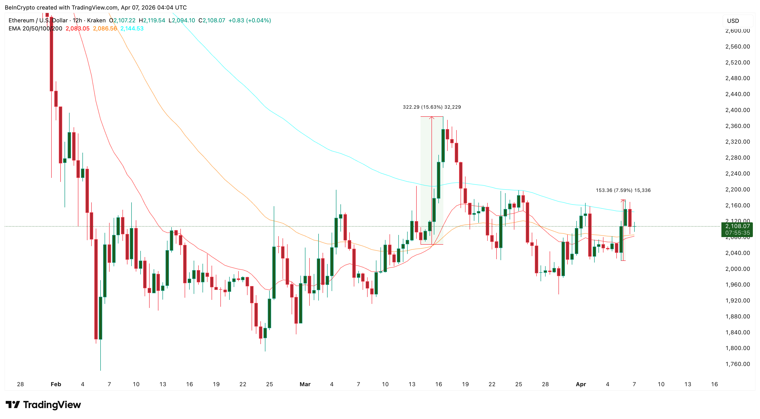 Der Ethereum ($ETH)-Kurs liegt am 7. April auf dem 12-Stunden-Chart bei 2.108 USD, etwa 1% niedriger als vor 24 Stunden. Die Kursbewegung wirkt unspektakulär. Allerdings zeigen vier verschiedene Kennzahlen aus der technischen Analyse, dem Derivate-Bereich und der On-Chain-Analyse auf das gleiche Ergebnis, und keine dieser Kennzahlen deutet auf einen Rückgang hin.