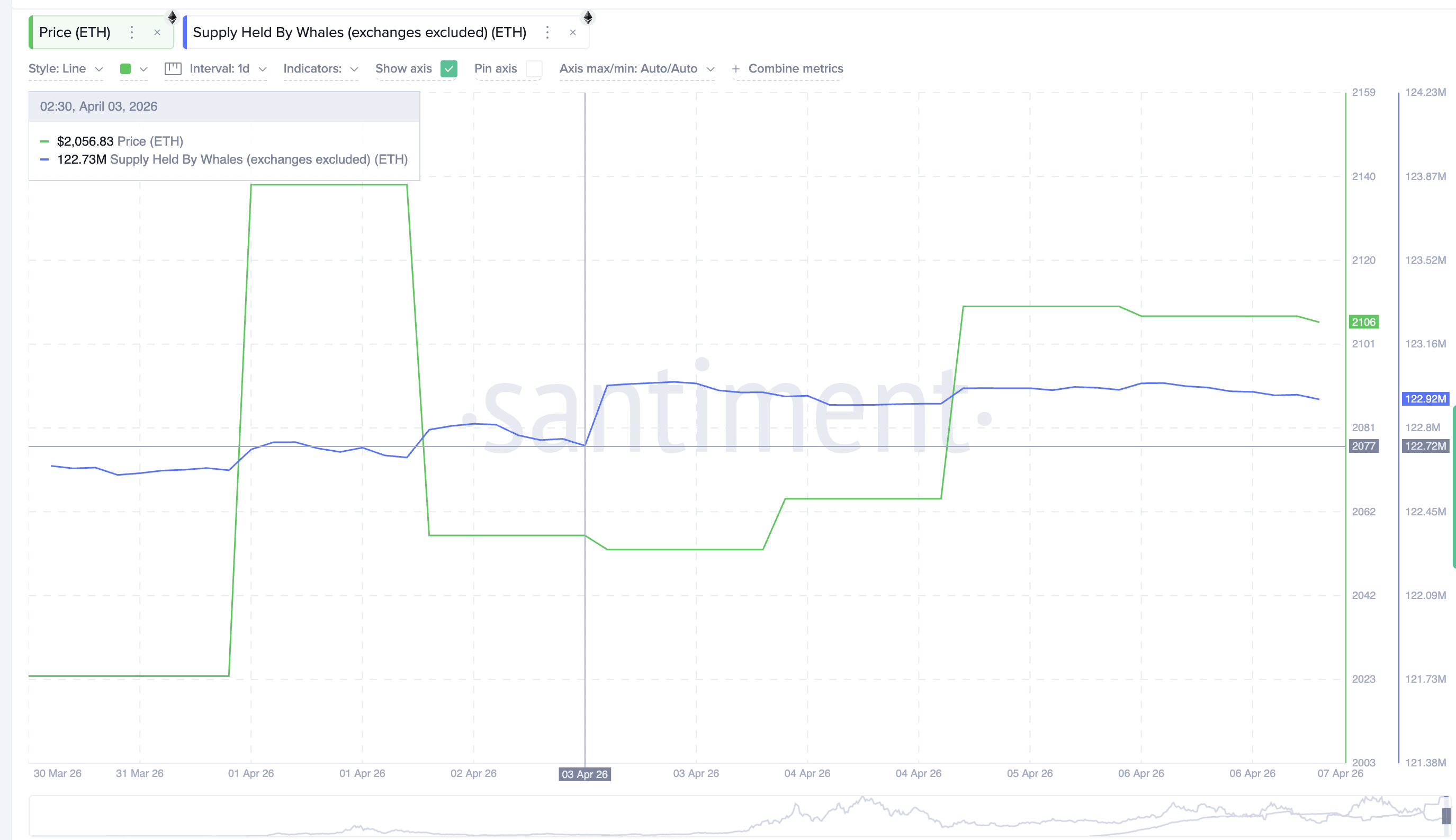 Die vierte Kennzahl betrifft das Muster der Wale. Seit dem 3. April haben die Wal-Wallets (ohne Börsen) ihren Bestand von 122,73 Millionen auf 122,92 Millionen $ETH erhöht. Diese Zunahme um etwa 190.000 $ETH beziehungsweise rund 400 Millionen USD zeigt eine stetige Akkumulation, jedoch keinen massiven Einkauf.