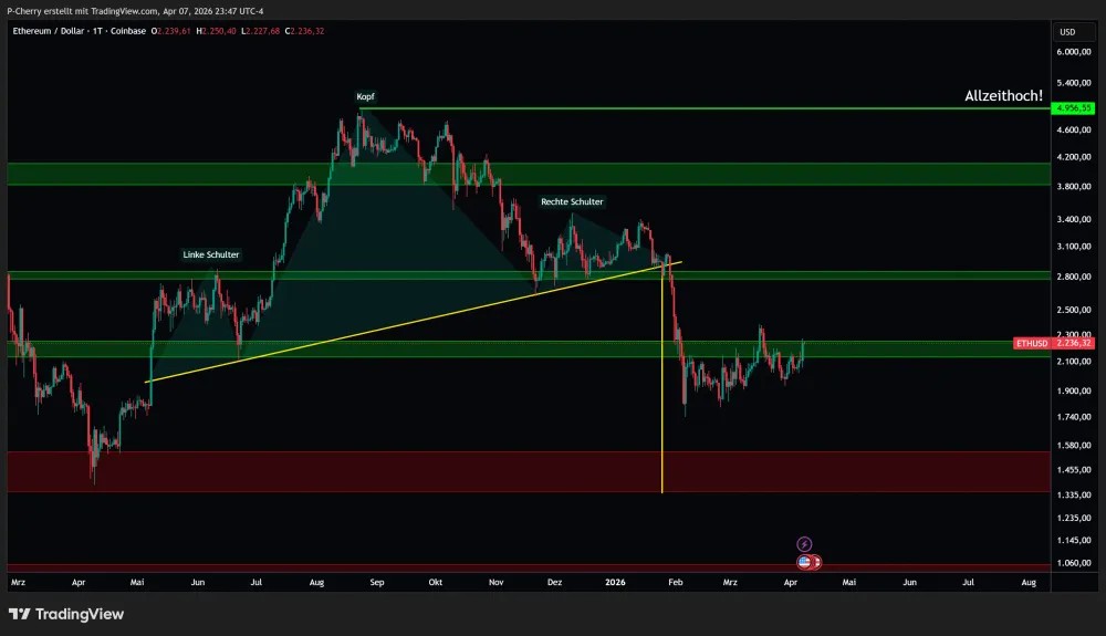 Nach der Ausbildung eines Head-and-Shoulders-Patterns kam es mit dem Bruch der Trendlinie zu einer deutlichen Abwärtsbewegung. Der Widerstandsbereich im grün markierten Kasten zwischen 2.130 US-Dollar und 2.248 US-Dollar wird derzeit erneut vom $ETH-Kurs versucht, zu überwinden.