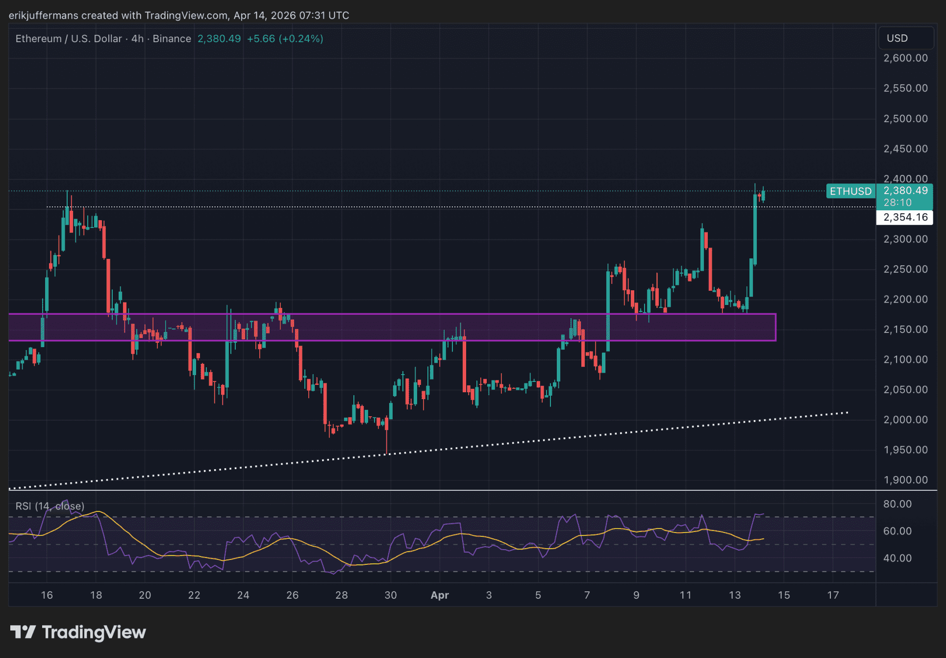 Gestern Nachmittag setzte $ETH seinen Anstieg ab 2.170 Dollar fort und notiert nun bei 2.380 Dollar. Damit wurde der kürzliche Höchststand vom 16. März durchbrochen, und es liegt nun offiziell ein höheres Hoch vor. Auch ist der aktuelle Kurs das höchste Niveau seit dem 1. Februar. Wie geht es nun weiter?
