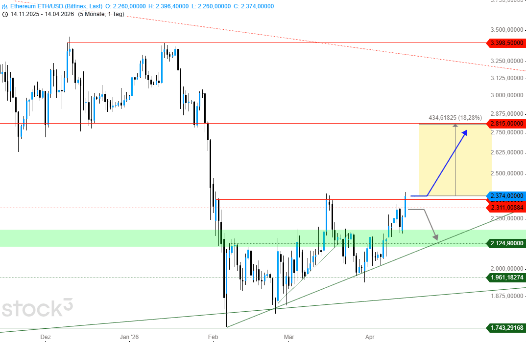 Ähnlich wie im März attackiert Ethereum den Widerstandsbereich von 2.311 bis 2.354 US$. Ein Tagesschluss darüber erlaubt, wie im Chart ersichtlich, eine Performance von circa +18% bis zum nächsthöheren Widerstand bei 2.815 US$. Der Weg scheint frei und somit darf man gespannt sein, ob es die Bullen endlich schaffen, nachhaltige Chartsignale zu liefern.