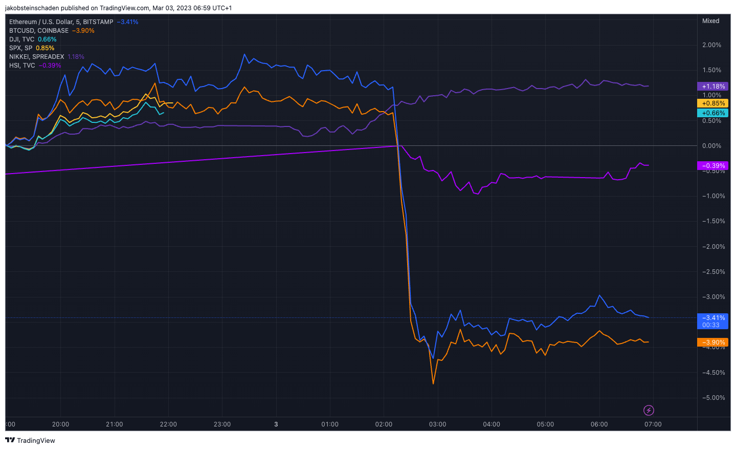 Innerhalb von 24 Stunden sind die Krypto-Märkte um 4 Prozent eingebrochen, Bitcoin und Ethereum deutlich um 4,5 Prozent. Mit großen Aktienindizes wie dem S&P500 aus den USA oder dem Nikkei 225 oder dem Hang Seng Index (HSI) für Asien gibt es keine deutlichen Korrelationen – deswegen muss der Einbruch in der Krypto-Industrie selbst seinen Grund haben. Und da ist naheliegend, dass sich viele Anleger:innen vor einem Crash der Silvergate Bank und daraus folgenden Schockwellen fürchtet. In diesem Chart sieht man den Einbruch von BTC und ETH, während NIKKEI und HSI weiter seitwärts laufen: