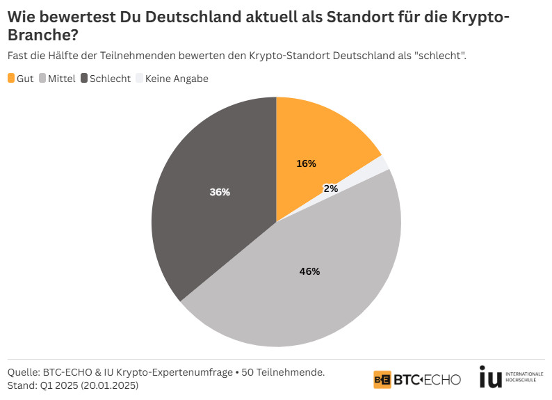 Wie die Umfrageergebnisse zeigen, sind lediglich 16 Prozent der Branchenexperten der Meinung, dass Deutschland ein guter Krypto-Standort ist. Über ein Drittel der Befragten gibt sogar das Urteil “schlecht” ab. Das sind sicherlich keine Ergebnisse, auf die man in Deutschland stolz sein kann.