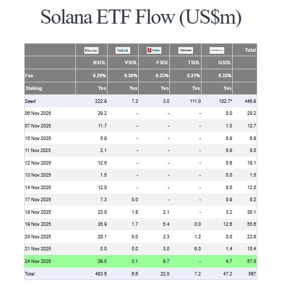 Solana hielt stand und zog am 24. November Nettozuflüsse von 57,99 Millionen US-Dollar an.