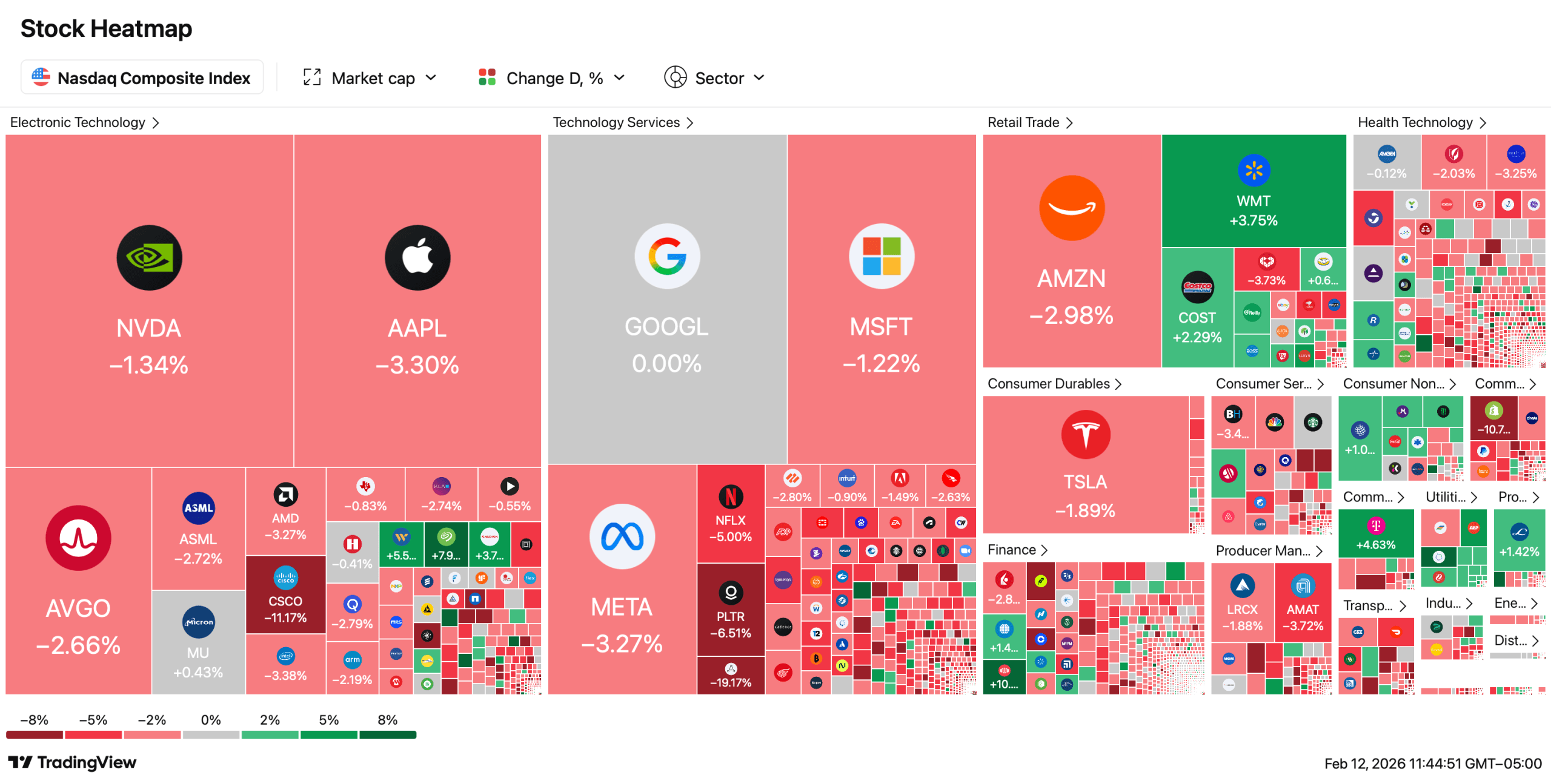 Am späten Vormittag des 12. Februar pendelte der Dow bei 50.145 Punkten, was einem Anstieg von rund 23 Punkten oder 0,05 % entspricht, während der S&P 500 um etwa 28 Punkte oder 0,41 % auf rund 6.913 Punkte nachgab. Der Nasdaq Composite fiel um 216 Punkte oder 0,94 % auf etwa 22.850 Punkte. Der NYSE Composite schnitt mit einem Plus von etwa 18 Punkten auf 23.498 Punkte besser ab.