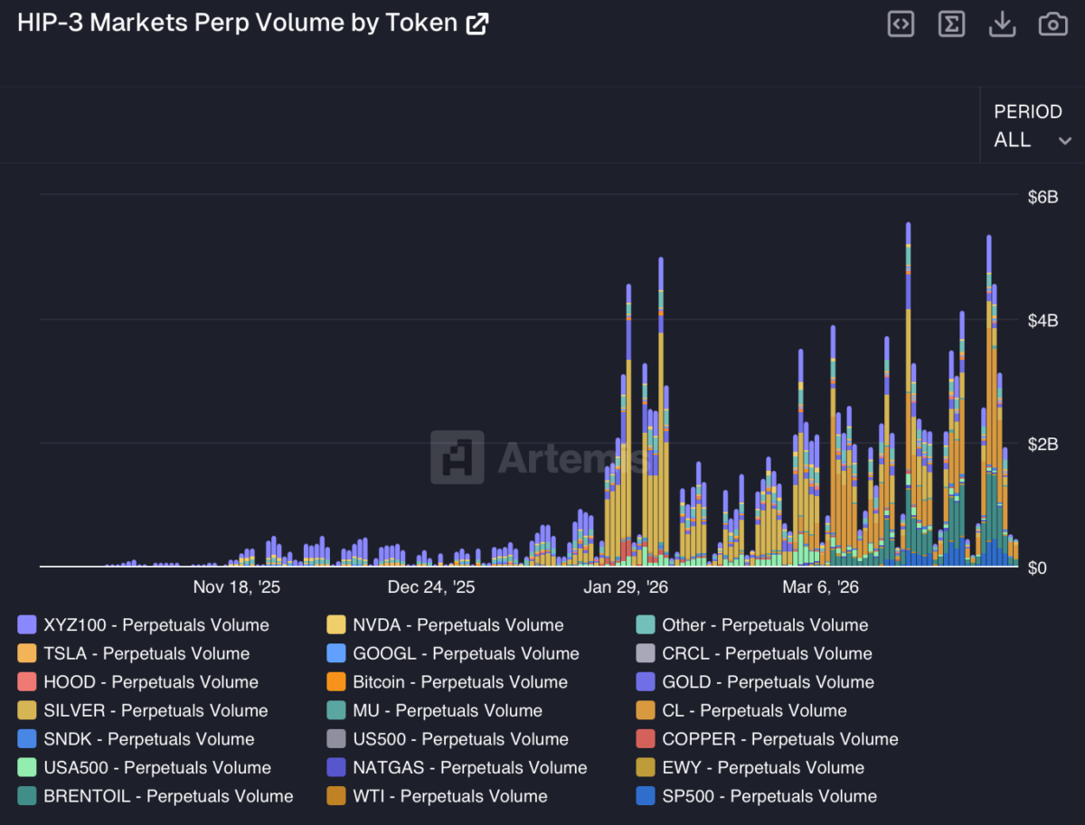 Im dezentralen Bereich hat sich Hyperliquids erlaubnisfreies HIP-3-Framework als Infrastrukturschicht etabliert, die dies in kürzester Zeit ermöglicht und es im Prinzip jedem erlaubt, unbefristete Terminmärkte für Aktien und Rohstoffe ohne Kontrollinstanz zu starten. Bemerkenswert ist, dass die Plattform mittlerweile mehr Rohstoffe verarbeitet als Bitcoin selbst, wobei WTI-Rohöl, Brent-Rohöl, Silber und Gold-Perpetual-Futures den Großteil des Handelsvolumens ausmachen.