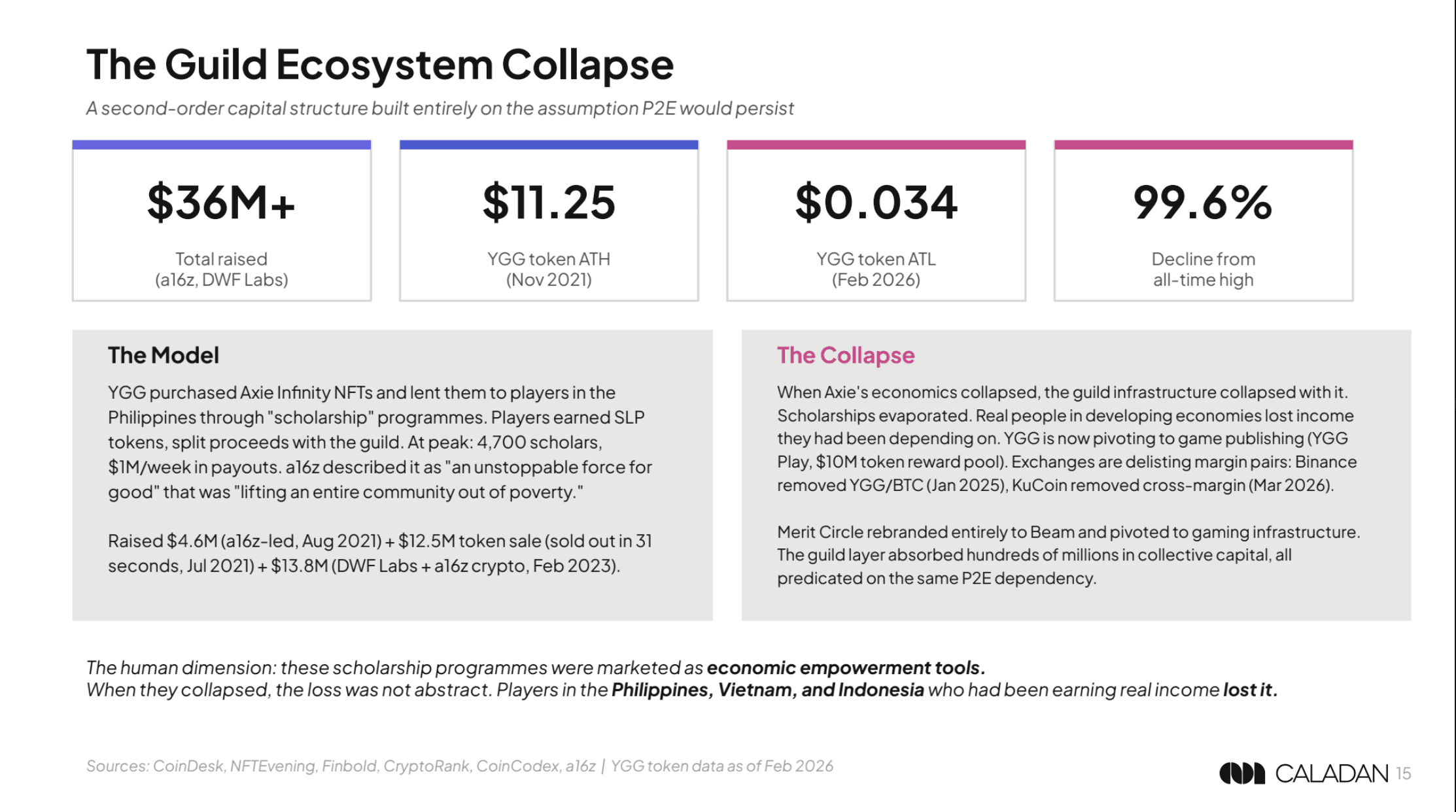 "Kapital wurde gleichzeitig auf allen Ebenen vernichtet," heißt es im Bericht, der auf Risikokapital, private $NFT-Käufer, Gaming-Gilden und Telegrams 300-Millionen-Nutzer starke Tap-to-Earn-Welle als parallele Opfer hinweist. Hamster Kombat allein verlor innerhalb von sechs Monaten nach dem Start 96 % seiner Nutzer. YGG, der Flaggschiff-Token der Gaming-Gilden, handelt 99,6 % unter seinem Höchststand von November 2021.