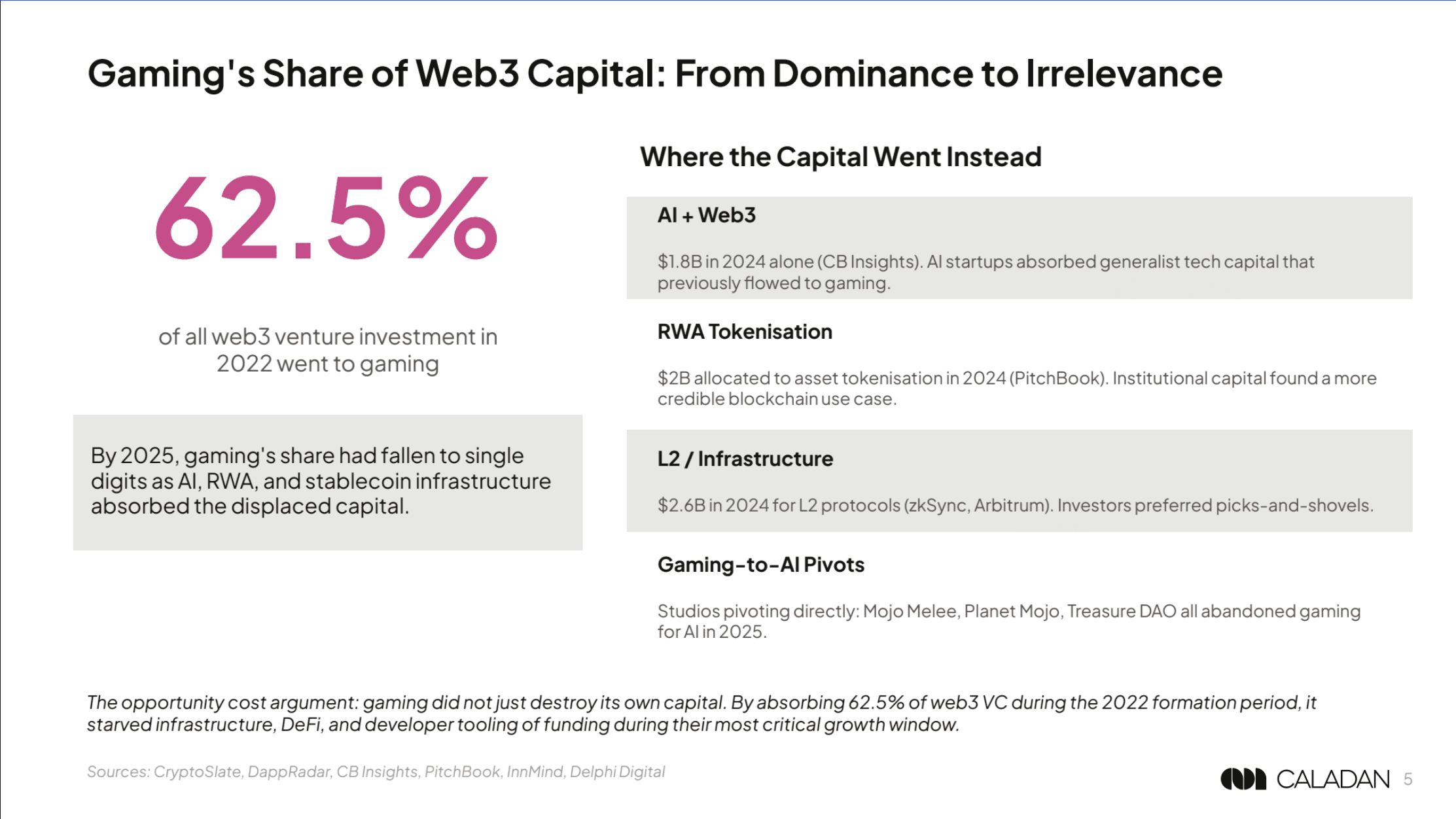 Der aussagekräftigste Datenpunkt könnte stattdessen sein, wohin das Geld geflossen ist. Im Jahr 2022 entfielen 62,5 % aller Web3-Risikokapitalinvestitionen auf Gaming; bis 2025 war sein Anteil auf einstelliges Niveau eingebrochen, da KI, die Tokenisierung von Realweltvermögenswerten und Layer-2-Infrastrukturen das verdrängte Kapital aufnahmen.