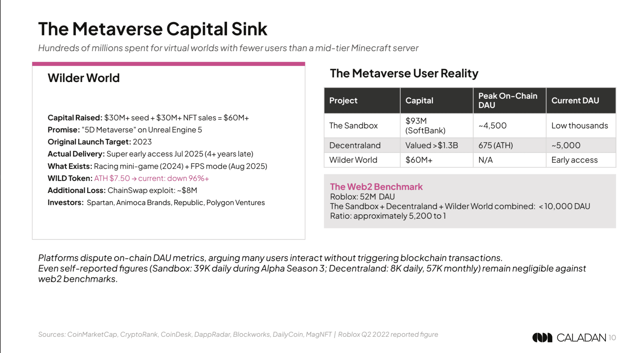 Daten von Caladan, ein Market-Making- und Handelsunternehmen, zeigt, dass etwa 93 % der sogenannten GameFi-Projekte mittlerweile de facto tot sind, wobei die Tokenwerte im Vergleich zu ihren Höchstständen im Jahr 2022 um etwa 95 % gefallen sind und die Finanzierungen für Studios bis 2025 um 93 % zusammenbrechen werden.