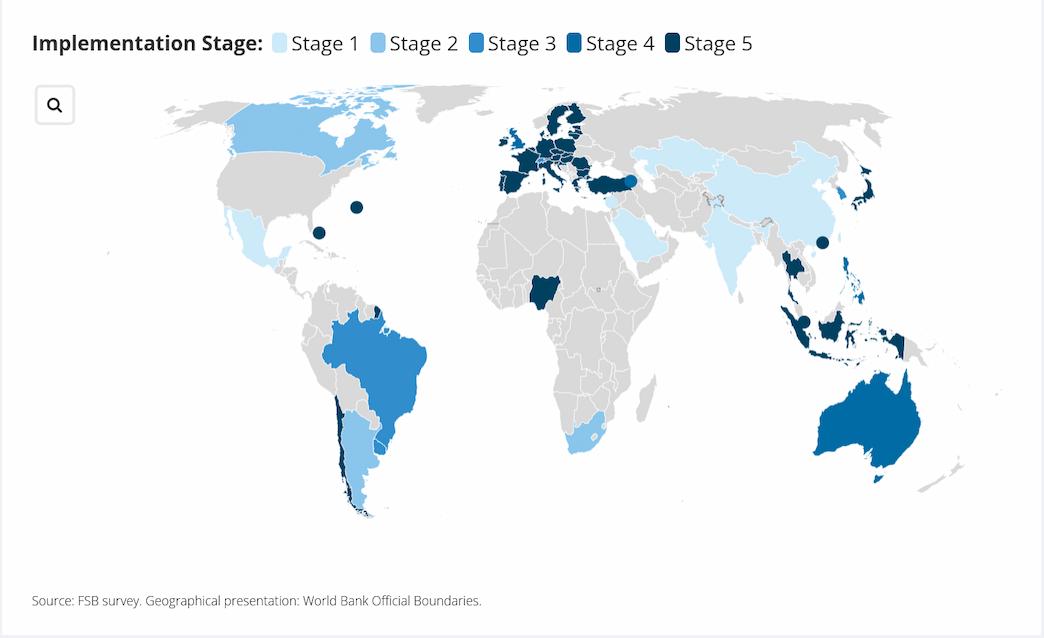 Auf einer Weltkarte markierte der FSB die Länder der Erde mit ihrem aktuellen Entwicklungsstatus. Einige der Länder haben die geforderte Krypto-Regulierung demnach bereits umgesetzt – etwa die EU, aber auch Nigeria, Japan oder Chile. Im Bereich der Stablecoin-Regulierung bestehe mehr Nachholbedarf – hier erfüllten nur die EU und Japan sämtliche Forderungen.