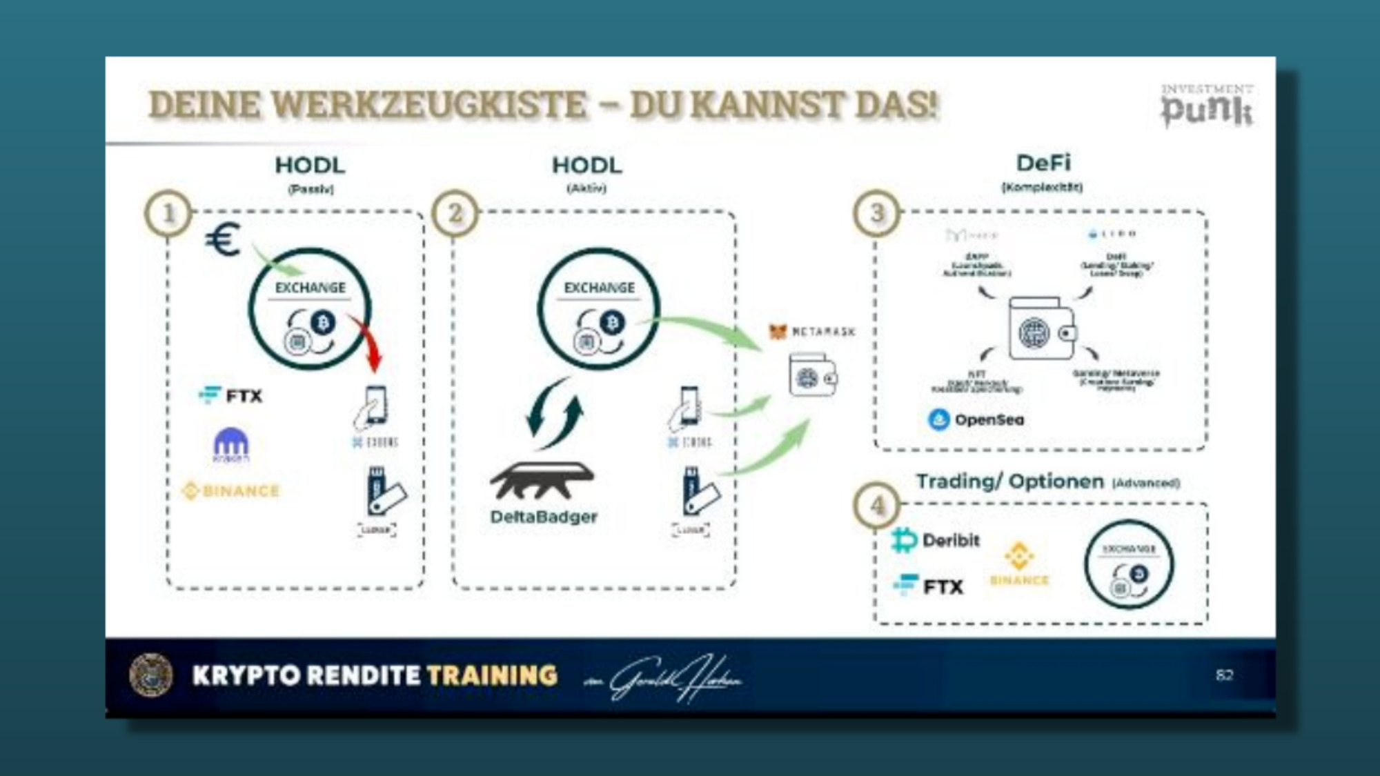 Hörhan, YouTube-Nutzer:innen sicher besser als „Investment Punk“ bekannt, bietet auch sehr populäre Kurse für Investments in Immobilien an und bezeichnet sich als Selfmade-Multimillionär und Business-Influencer. Mit dem Krypto-Kurs sollte ausgerechnet im Jahr 2022 das Angebot der „Investment Punk Academy“ ergänzt werden. Die Theorie: Der Bärenmarkt ist ein besserer Startpunkt als mitten im Hype, wie man ihn 2021 gesehen hat. Der Kurs kostet 1.197 Euro und soll auch das notwendige Wissen vermitteln, um seriöse Projekte von unseriösen Projekten unterscheiden zu können.