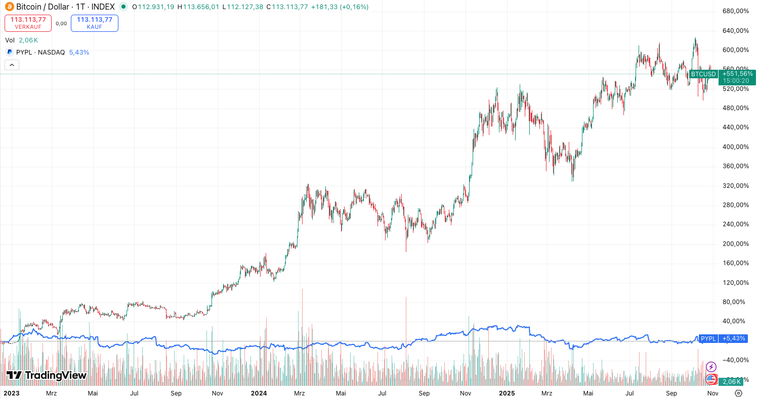 Wer 1.000 Euro Anfang 2023 in Bitcoin investierte, hält heute rund 6.800 Euro. Wer denselben Betrag in PayPal investierte, steht aktuell bei etwa 1.035 Euro – dafür mit Dividende und weniger Risiko.