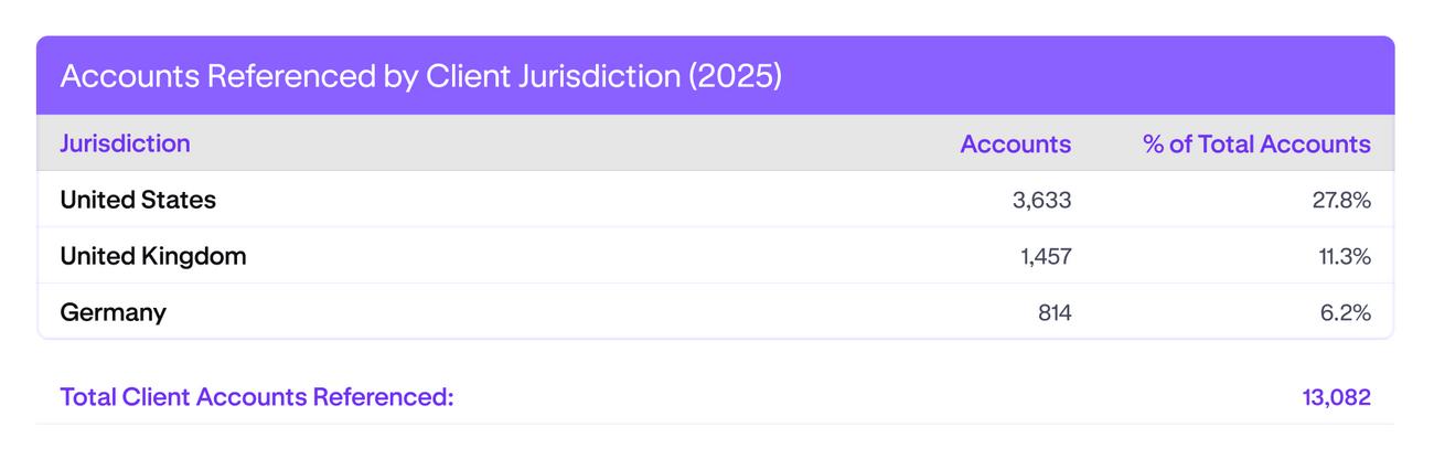 Krakens Daten belegen: Deutsche Behörden weisen bei der Überwachung von Krypto-Dienstleistern bereits besondere Aktivität auf. Mit 857 Anfragen im Kalenderjahr 2025 nehmen sie nach den USA den zweiten Platz ein. 10,7 Prozent aller Anfragen stammen aus der Bundesrepublik.
