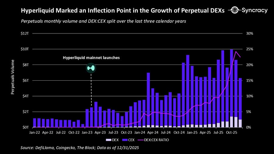 Gleichzeitig deutet sich ein Wandel in der Marktstruktur an. Über Jahre hinweg wurde der Krypto-Markt vor allem von zentralen Börsen geprägt. Mit Hyperliquid hat sich dieses Kräfteverhältnis jedoch verschoben. Die Plattform gilt als Beleg dafür, dass dezentrale Börsen nicht automatisch langsam, teuer oder wenig liquide sein müssen. Geringere Latenzen, effizientere Ausführung und eine konsequent auf Trading ausgelegte Infrastruktur haben dazu geführt, dass DEXes in diesem Bereich deutlich wettbewerbsfähiger geworden sind.