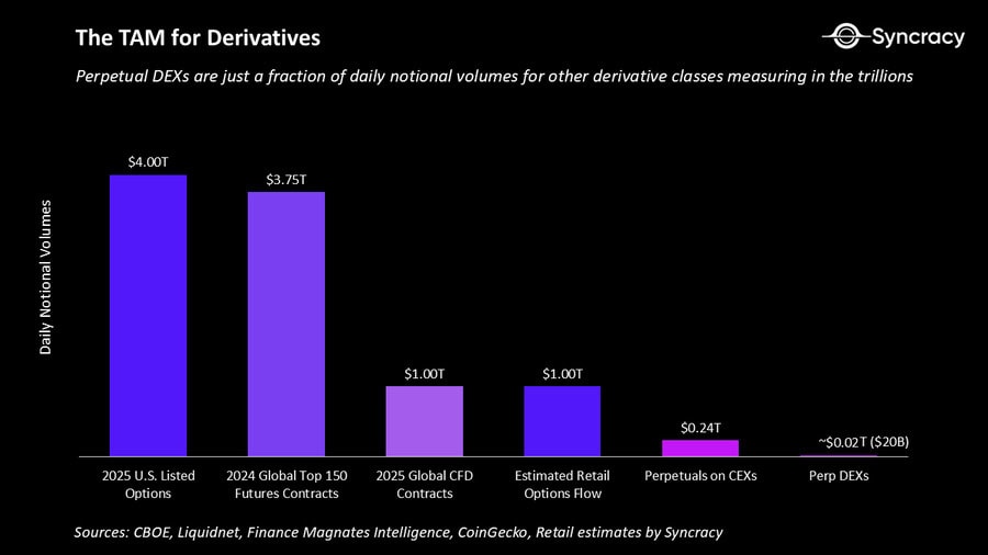Im Essay “The Great Perpification” beschreibt das Krypto-Research-Haus Syncracy Capital ein Szenario, in dem Perpetual Futures einen erheblichen Teil der heutigen Derivate-Märkte auf sich vereinen. Dahinter steht die Annahme, dass Perps wegen ihrer strukturellen Vorteile gegenüber klassischen Futures und CFDs weit über den Krypto-Markt hinaus an Bedeutung gewinnen und sich zum bevorzugten Spekulationsinstrument für Privatanleger entwickeln könnten. Sollten Krypto-DEXs wie Hyperliquid oder Lighter dabei tatsächlich einen spürbaren Anteil dieses Marktes erobern, könnte sich das deutlich in den Kursen niederschlagen.