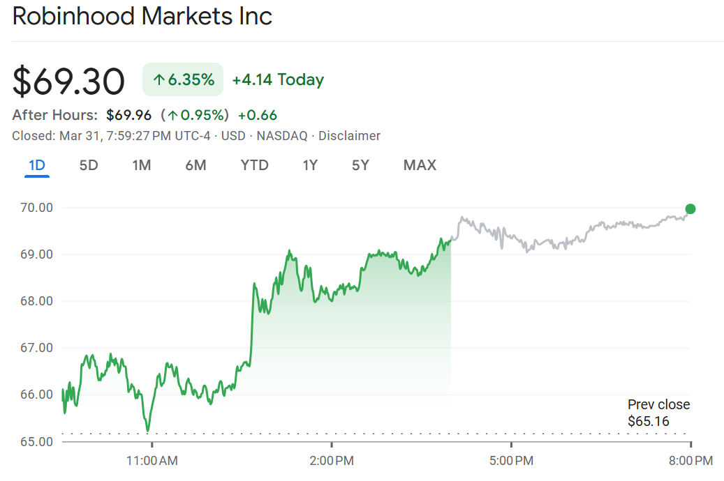 Die HOOD-Aktie reagierte auf die Dynamik und stieg am 31. März um 6,35% auf 69,30 USD. Nachbörslich legte sie noch auf 69,96 USD zu.