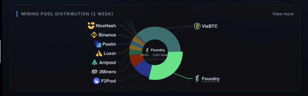 Genau dieses Konzept überträgt Foundry nun auf Zcash. Der neue Zcash Pool konnte innerhalb kürzester Zeit rund 30 Prozent der gesamten Netzwerk-Hashrate auf sich vereinen – ein außergewöhnlich schneller Anstieg, der klar zeigt, dass die Nachfrage nach institutioneller Infrastruktur im Privacy-Segment real ist. Mehrere große Mining-Kunden sind bereits onboarded und liefern kontinuierlich Rechenleistung, was die Position des Pools weiter stärkt.