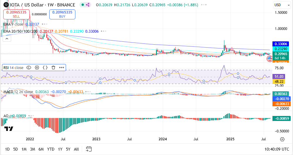 Trotz diesem nahezu optimalen Umfeld, ist der IOTA-Kurs weiterhin in einer Konsolidierungsphase. Der Token wird derzeit bei 0,2135 Dollar gehandelt, nachdem er letzte Woche 14% zulegte.