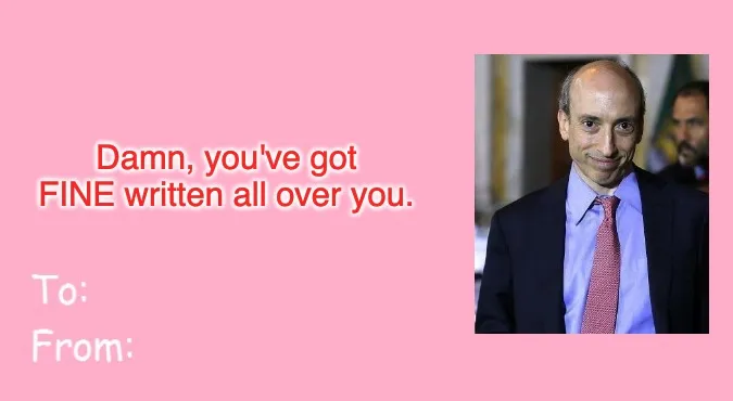 Auch der Vorsitzende der US-amerikanischen Börsenaufsicht (SEC) kann seine zweideutige Anzüglichkeit am Valentinstag kaum zurückhalten. Neben seinem reserviert-verliebten Grinsen stehen die Worte: