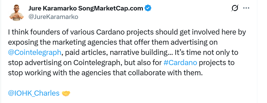 Hoskinson forderte auch Krypto-Initiativen dazu auf, Anzeigen zurückzuziehen und die Veranstaltungen von Cointelegraph zu schwänzen, wobei er den Streit als eine umfassendere Angelegenheit der journalistischen Integrität innerhalb der digitalen Währungsbranchedarstellte . Er vertrat die Ansicht, dass Transparenz niemals als Druck ausgegeben werden dürfe , sondern als unverzichtbarer Standard einer verantwortungsvollen Berichterstattung angesehen werden müsse.