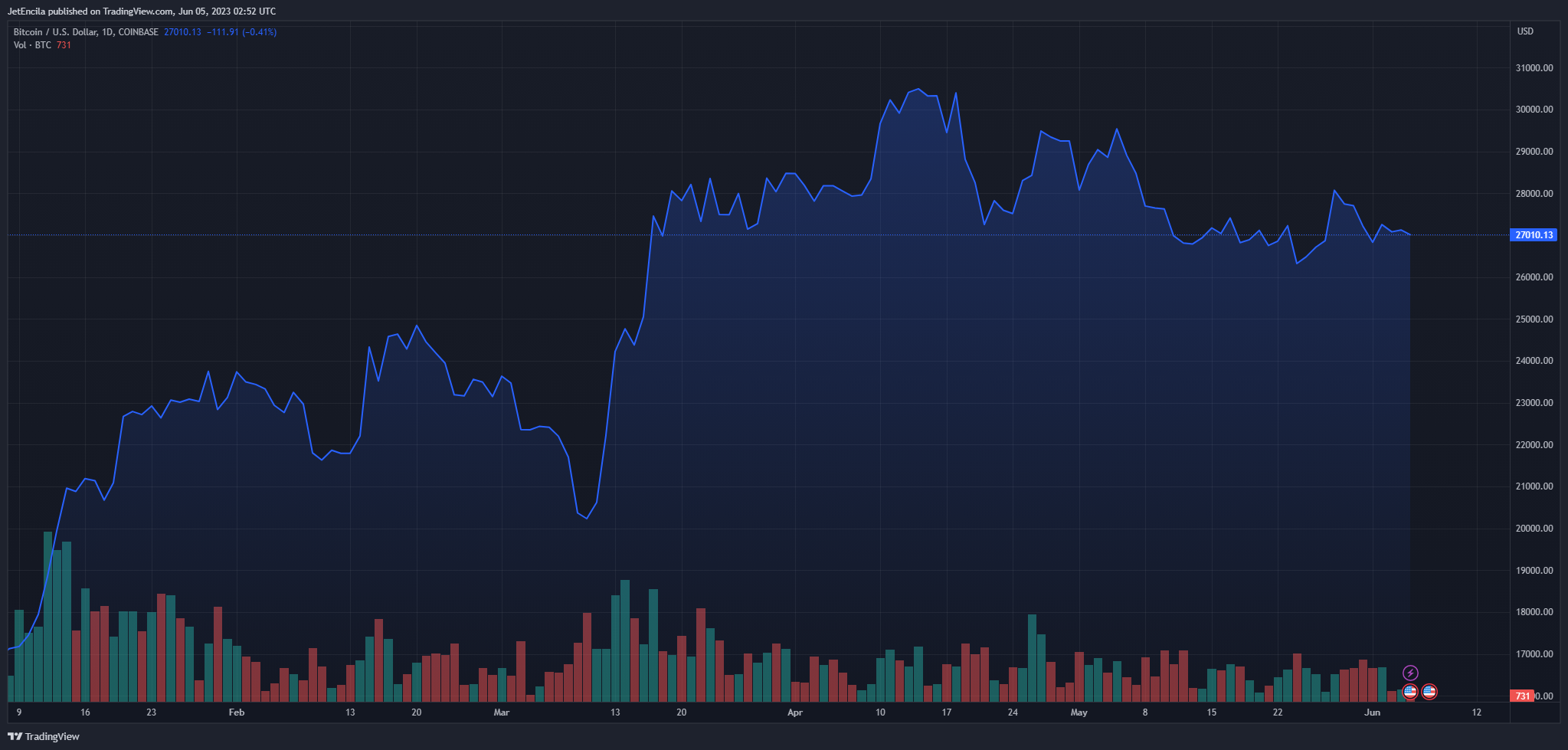 BTCUSD ist nur noch wenige Zentimeter davon entfernt, erneut in die 26-Dollar-Marke zu fallen. Diagramm: TradingView.com