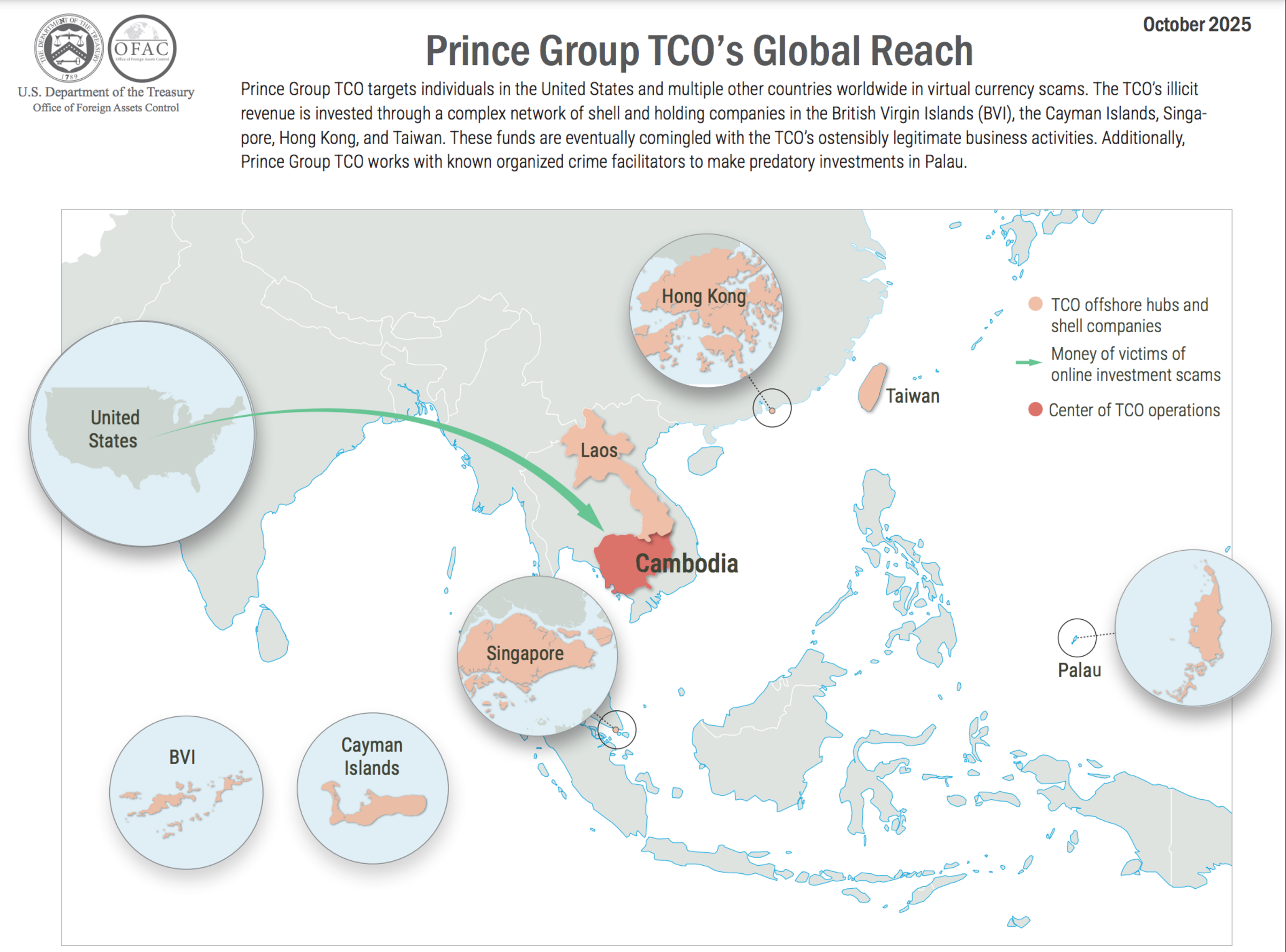 Zusätzlich wurde die Prince Group vom US-Finanzministerium als transnationale kriminelle Organisation eingestuft. Die Abteilungen Office of Foreign Assets Control (OFAC) und Financial Crimes Enforcement Network (FinCEN) verhängten in enger Abstimmung mit dem britischen Außenministerium (FCDO) Sanktionen gegen insgesamt 146 Personen und Entitäten: darunter Chen Zhi, seine Komplizen sowie zahlreiche verbundene Unternehmen.
