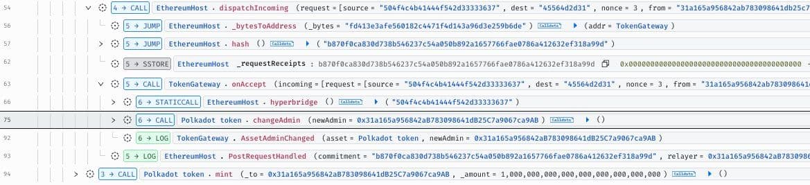 On-Chain-Spuren zeigen, dass der Angreifer eine gefälschte Nachricht über dispatchIncoming eingesendet hat, welche an TokenGateway.onAccept weitergeleitet wurde.