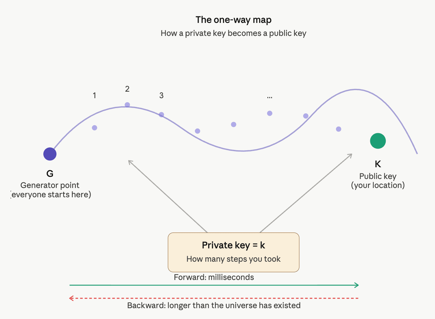 Die entscheidende Eigenschaft besteht darin, dass das Vorwärtsgehen einfach ist, während das Zurückgehen für klassische Computer praktisch unmöglich ist. Wenn Sie k und G kennen, dauert die Berechnung von K nur wenige Millisekunden. Wenn Sie K und G kennen und k herausfinden möchten, lösen Sie das, was Mathematiker als das elliptische Kurvendiskrete Logarithmusproblem bezeichnen.