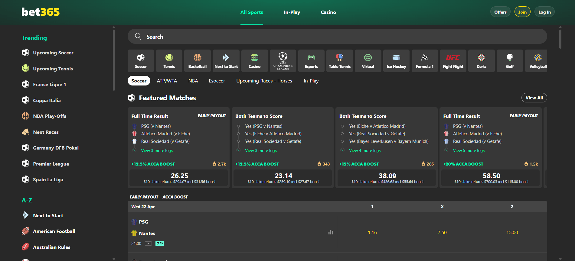 Bet365, launched in 2001, is a well-established name in online betting. It’s heavily regulated and is known for reliability rather than cutting-edge crypto-style speed, but it offers thousands of slots, live dealer games, table games, jackpots, and even game shows, and it has one of the biggest sportsbooks in the industry.