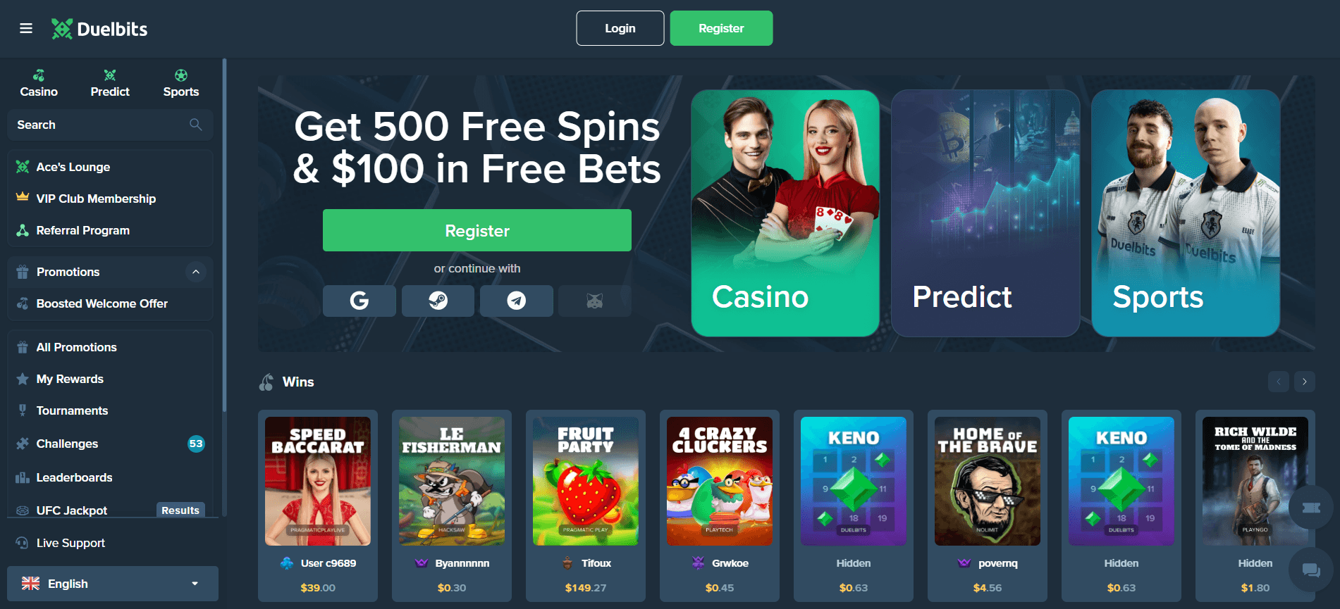 Launched in 2020, Duelbits offers around 4,000 games from 60+ providers, with slots, live casino, and provably fair originals like Dice Duels and Minesweeper. It also has a strong esports sportsbook, making it popular with bettors who like variety.